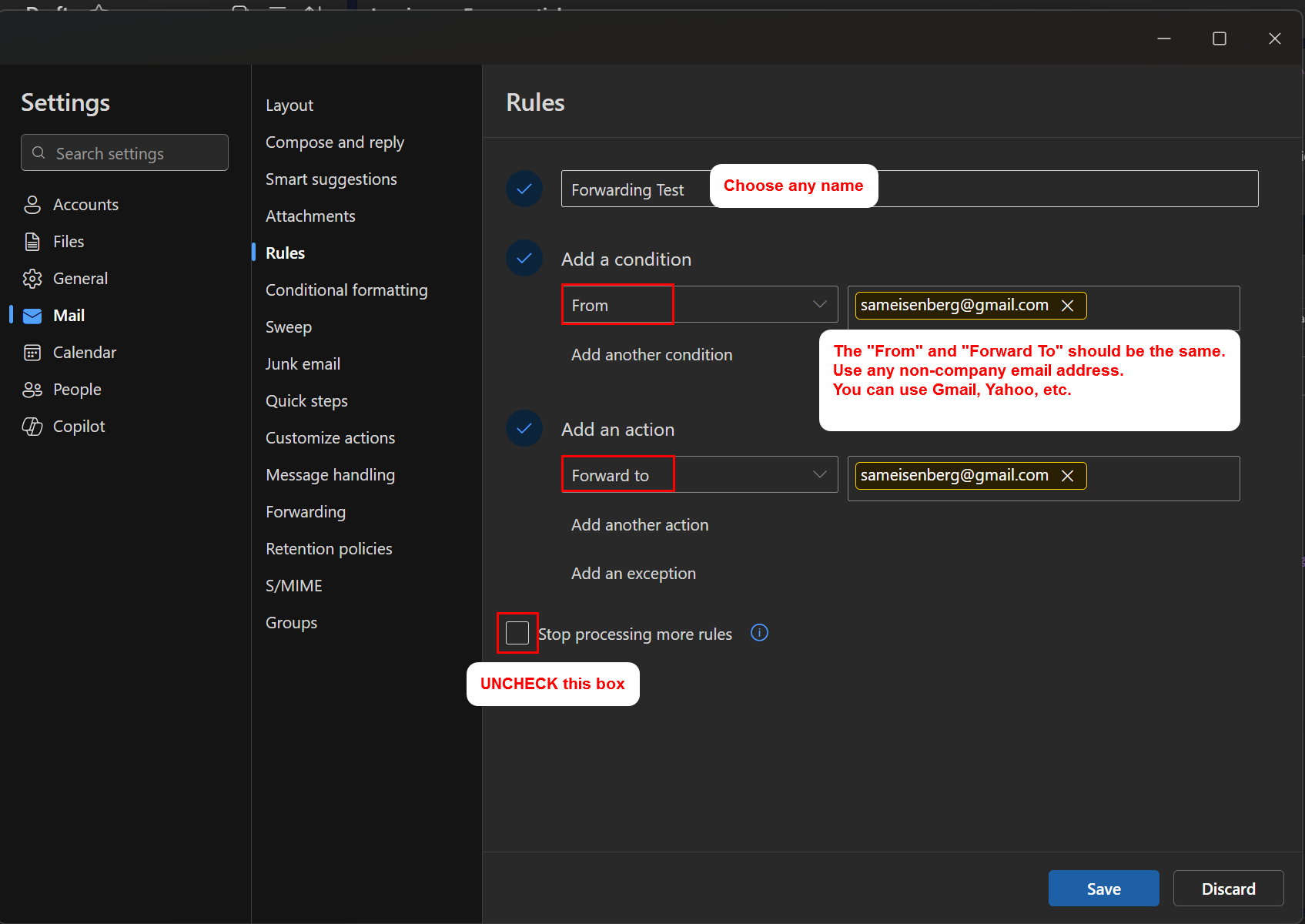 Forward toand enter that same personal email address again.Uncheck the box that says "Stop processing more rules."